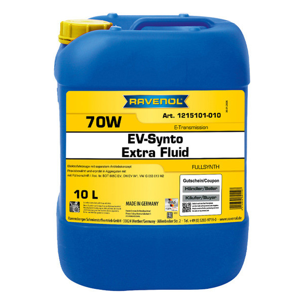 RAVENOL EV-Synto Extra Fluid 70W E-TF снижает трение и износ, обеспечивает увеличение срока службы автомобиля. Эффективно смазывает и охлаждает все компоненты трансмиссии электромобилей.