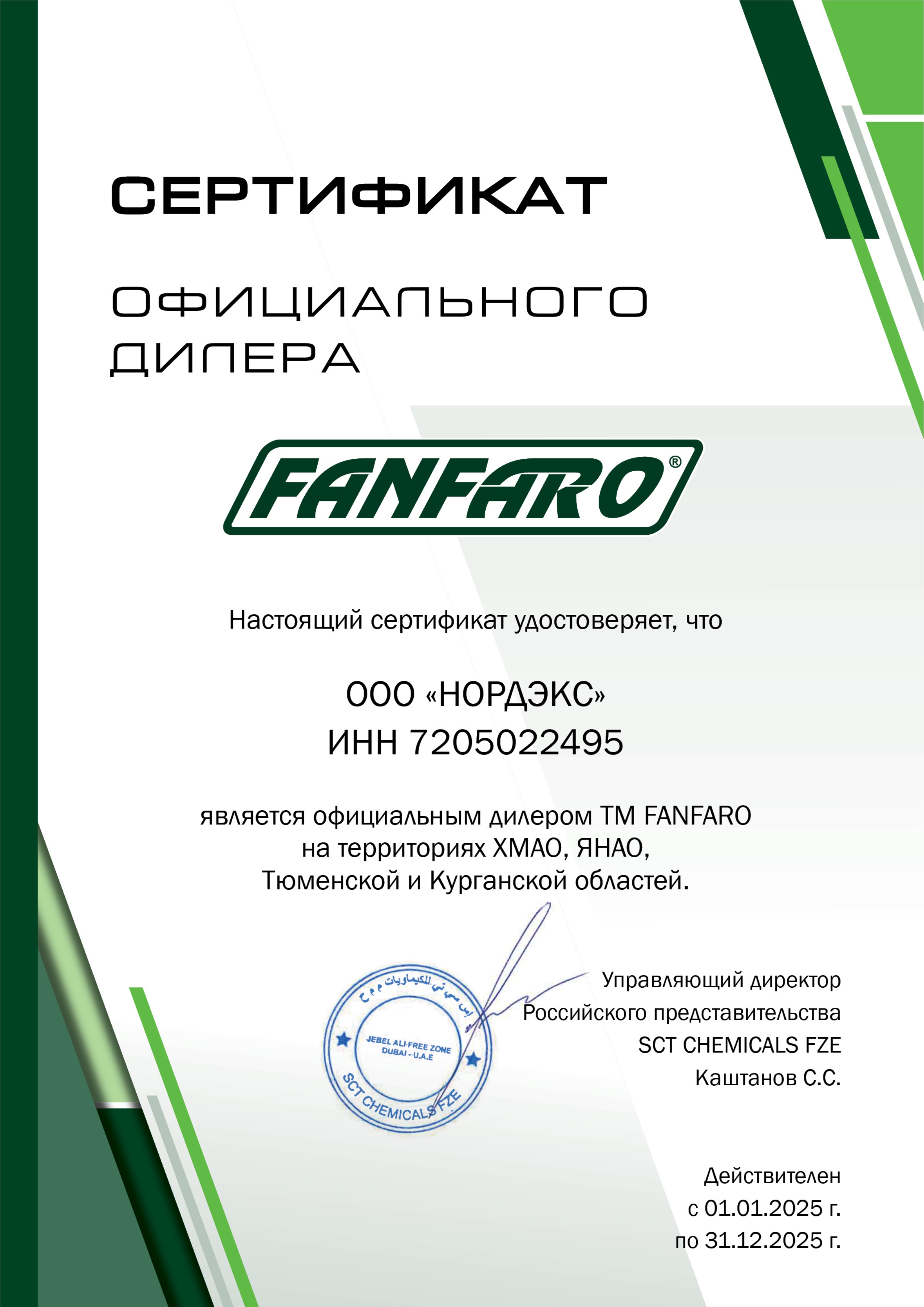 Компания НОРДЭКС является официальным дилером завода UAB SСT «Lubricants» Литва ЕС, на территории города Тюмени, Тюменской области, ХМАО, ЯНАО, города Курган, Курганской области, и занимается реализацией и развитием продаж торговой марки Fanfaro.